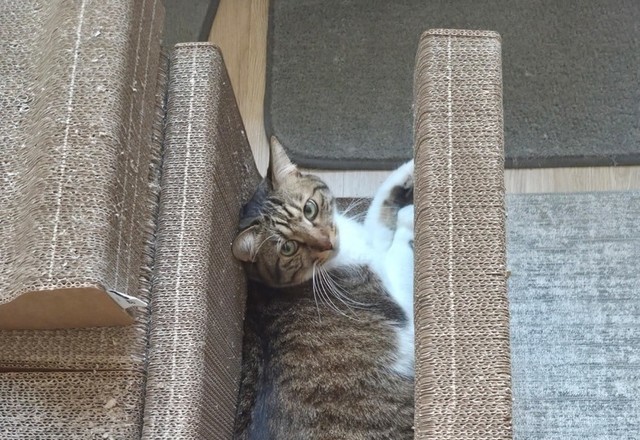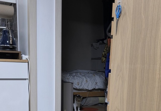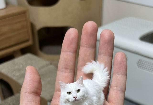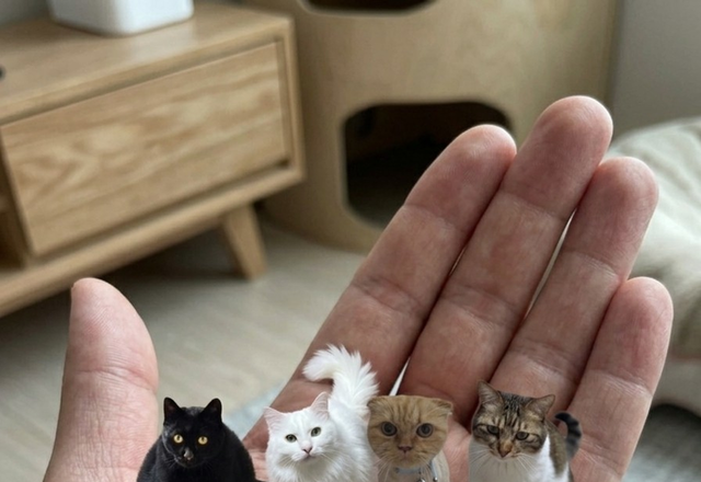 ai에게'이 사진의 고양이를 포켓사이즈 로 만들어서 손바닥 위에 서있게해줘 위에서 바라보는 각도로 해줘 고양이의 눈코입 배열과 배치는 건드리지말고 얼굴형과 표정, 눈동 자크기는 변화없게해줘'라고 하면 됩니당~~