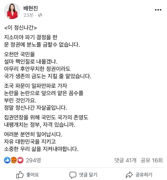 배현진 지소미아 종료 분노