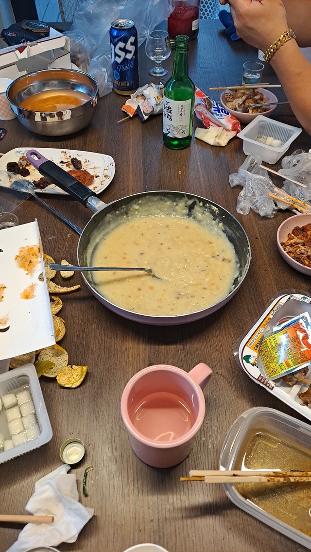지인집에 집들이 갔다왔어요처음엔 한상차림이었는데...점점 난장판이 ㅎㅎ가운데 후라이팬에 담긴 쇠고기 수프 모양은 저래도 맛은 있네요