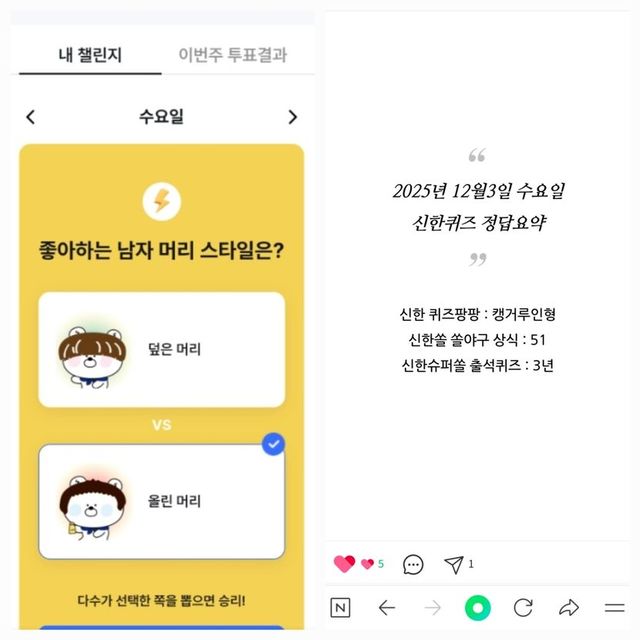9 7시 오퀴즈 : 하🍎연말 선물뽑기🍎친구가 100% 당첨 선물을 보냈어요! 2025 핫템 ‘국중박 뮷즈’부터 다이소, 깐부치킨, 엔비디아 주식까지~!https://promotion.okcashbag.com/event/common/lucky/draw/year-end/web.mocb?inviteKey=v4XFWcPa6f37오퀴즈 미리보고 2개숏폼 보고 적립 2원 1개 투표 1원https://ogog.kr/feed/detail/3122001?ref=7f8217be27f84b4bb03968cc2ec57b94투표 2원https://ogog.kr