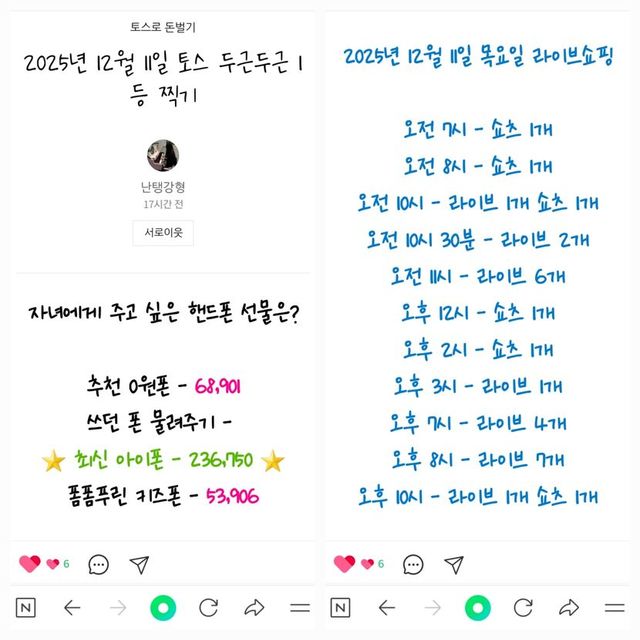 16 네이버페이 25원7시30분 10원 (9시30분까지)https://campaign2.naver.com/npay/v2/click-point/?eventId=cr_shoppinglive_251209_140315원https://campaign2.naver.com/npay/v2/click-point/?eventId=cr_2025120806_2512_1777매거진 보고 적립 2원숏폼 보고 적립 2원 2개 투표 1원https://ogog.kr/feed/detail/3112827?ref=2a0bc83a607747daa1575fb2f96af4b9투표