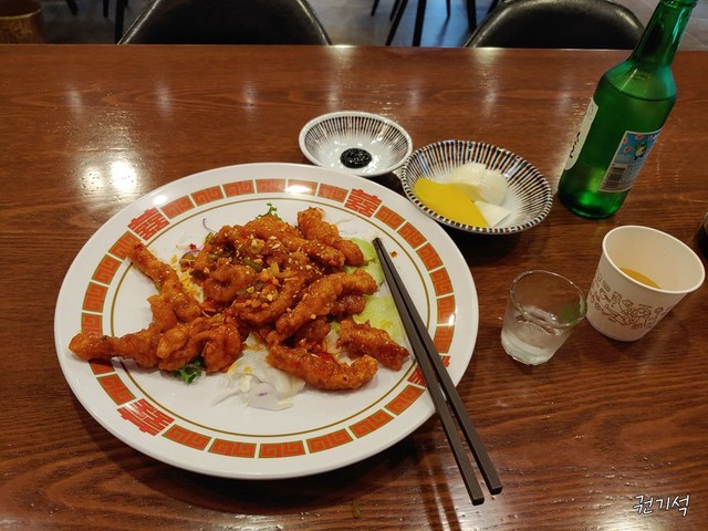 저녁으로 홍등에서 깐풍육먹으며 한잔하는 중이예요.내일ㅈ대전에 1박2일로 올라가게 되어서 일찍 자야되어서 좀 일찍 저녁과 함께 한 잔하고 있어요.여긴 요일별로 특선요리가 있어요.물론 미니양이지만 혼자 먹기는 알맞네요.