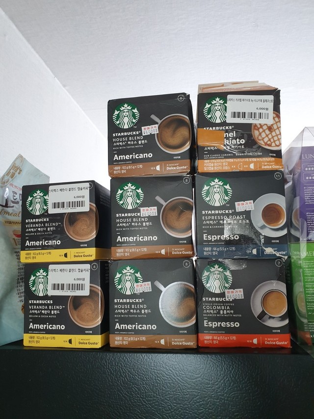 아침부터 리퍼매장 출근도장!!스타벅스 캡슐 있는거 몽땅 사오기!!마트에서는 7900원씩 리퍼매장에서는 6000원씩 8박스 48000원여기에 5프로 할인!!45600원에 득템했당😁😁😁몇일있다가 또가서 또 사와야지ㅎㅎ스타벅스 커피 저렴하게 먹는 이기분ㅎㅎ아침를 아.아로 시작해야겠다 😊