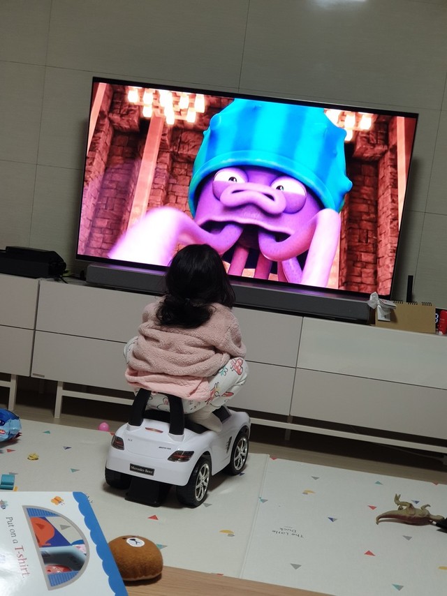 25개월 우리딸 티비보는 자세 끝내준다👍👍뒤에 의자에 앉아서 보라고 해야하는데....자세가 너무 웃겨서 사진 먼저 찍게된다😁😁