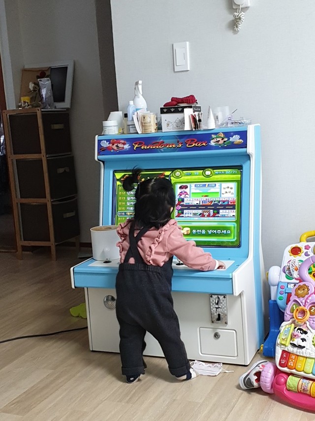 아빠 회사 간 사이 아빠꺼 레트로 게임기 탐내는 우리 귀요미♡나중에 커서 아빠랑 한판 하겠는데??!