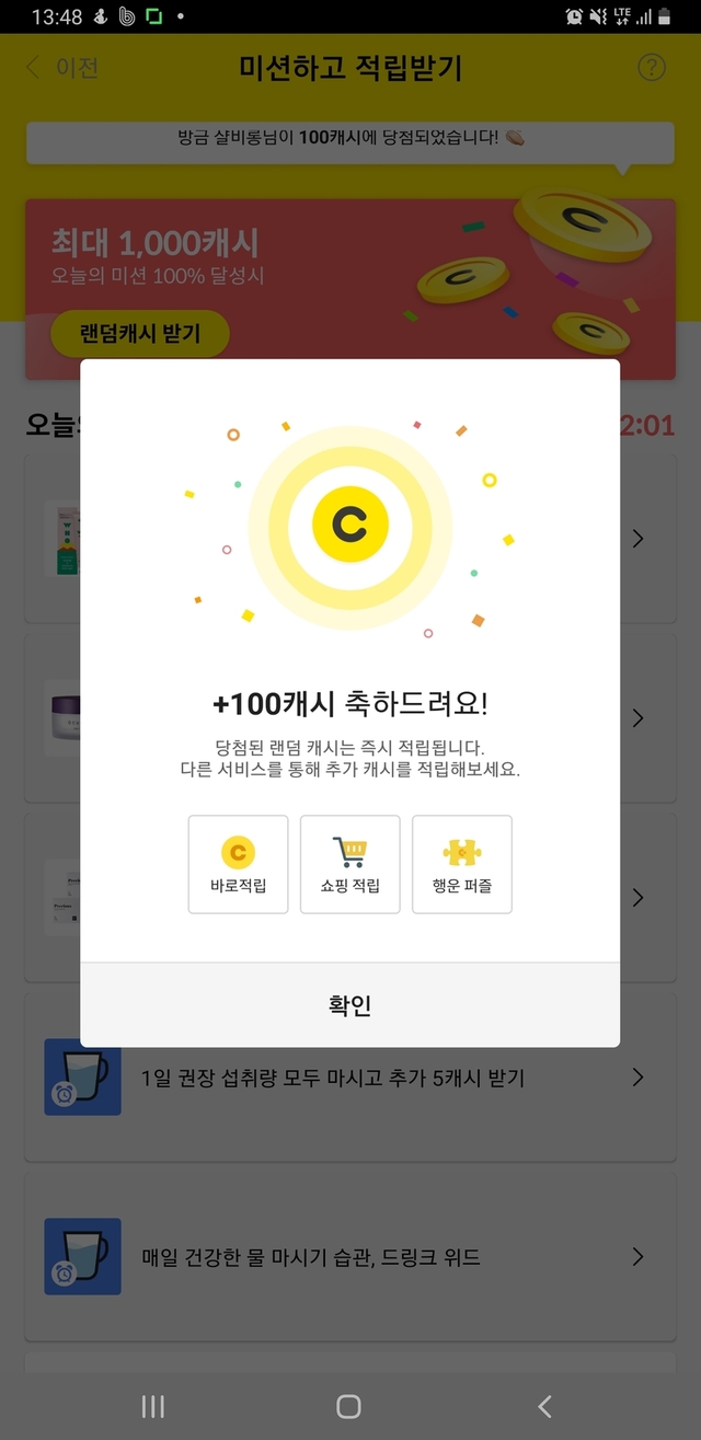 한번씩 이렇게 100캐시가 당첨되네요~^^