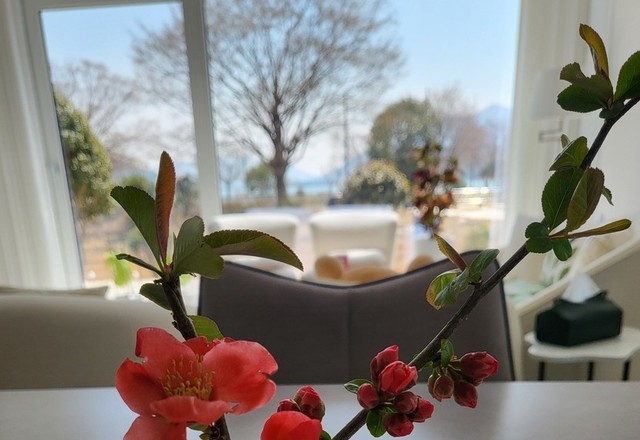 산당화라고 한다는데 저는 명자나무꽃으로만 불렀어요.저희집 울타리에 넘 이쁘게 폈네요.나무에겐 미안하지만 두가지 꺾어왔어요
