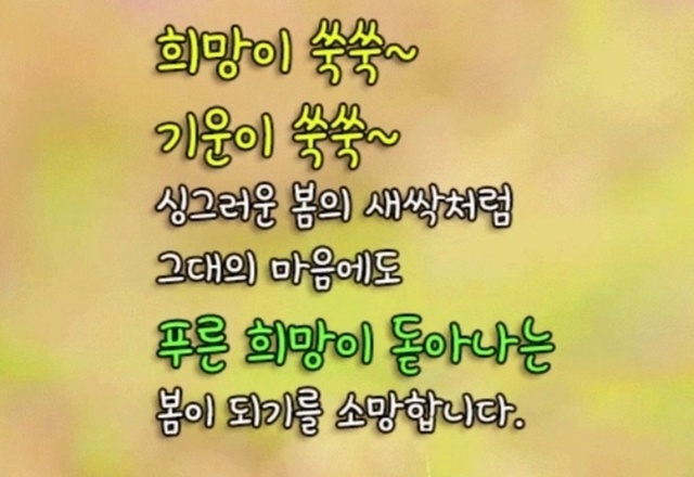 14 봄의 속삭임노오란기지개 펴는 소리들리시나요...그 추웠던 겨울을 잘 이겨 내고 파릇파릇 새싹들의 속삭이는 소리들리시나요...삼월은당신과 나의 마음을 예쁘게 장식하지 않아도 그저 좋은 날들로함께라도 웃을 수 있는 날들이었음 좋겠습니다추운 겨울 잘 견디어준자연들과 더불어서노래하고 느끼고사랑해줄 수 있는우리들의 합창소리가 늘 행복했음 좋겠습니다웅크렸던 마음활짝 열어서이 봄 예쁘게 색칠할 수 있는 당당한 우리가 되기로 해요닫힌 마음 활짝 열면당신도 나도 그리고 이 봄도 모두 모두 행복할 테죠- 좋은글 中에서 -