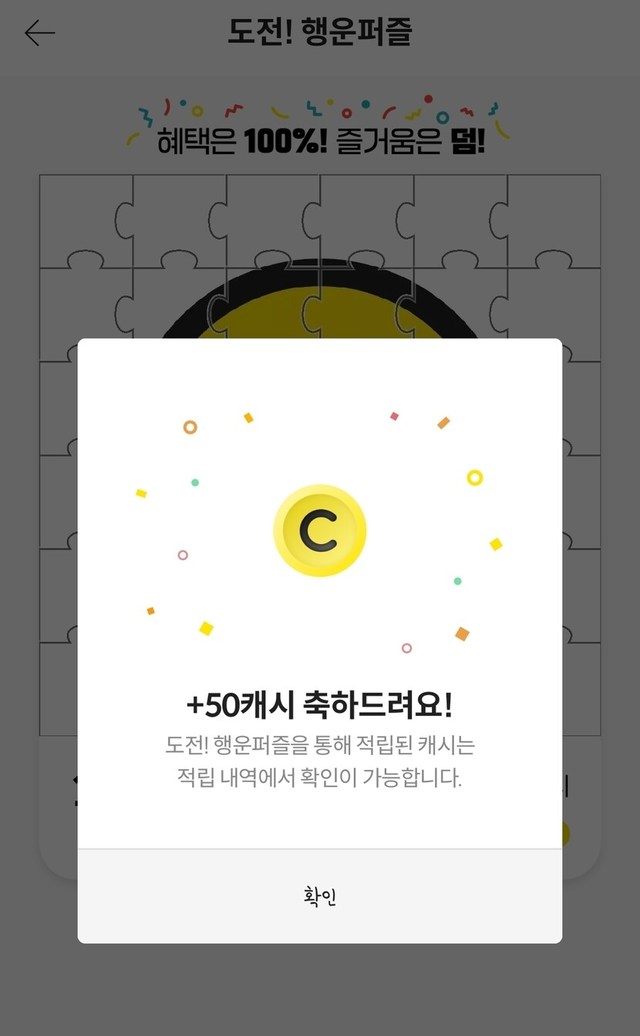 오늘의 행운 퍼즐 수확!100캐시만 제외하고 모두 성공했어요ㅎㅎ100캐시는 꼭 마지막에 실패하길래 50캐시부터 시작해봤어요.매번 시간 멍때리다가 50이랑 10만 성공했는데 이번엔 100캐시만 제외하고 모두 성공해서 자랑하러ㅎㅎㅎ!10캐시는 막판에 오류가 생겨서 그 순간을 못 잡았네요!