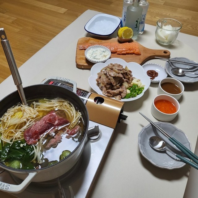 샤브샤브 연어사시미 꼬들목살 소주