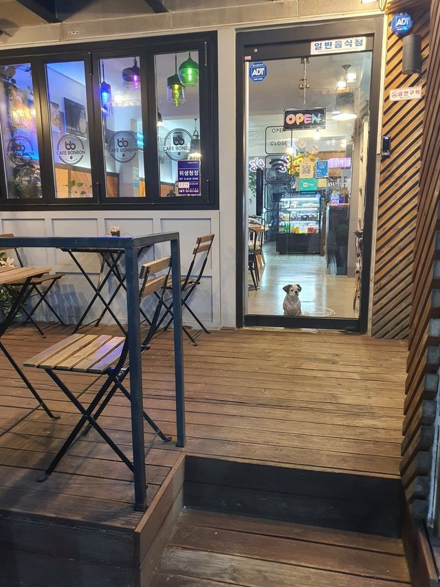야간산책하다가 어느카페안에 강아지가 밖을내다보길래 아는척을 거의10분이나 까꿍까꿍 얼르고 별짓을 다했건만 미동도 안하드라구여~~졌다졌어~~ㅋㅋ