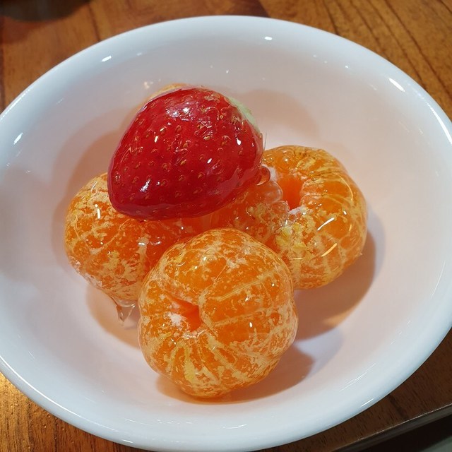 설탕시럽을 묻혀만든 과일이네요.색다른 맛이지만 당 섭취량이 많은거 같아요