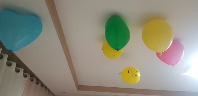 아이들이 풍선 불어서 천장에 붙여두었네요~~