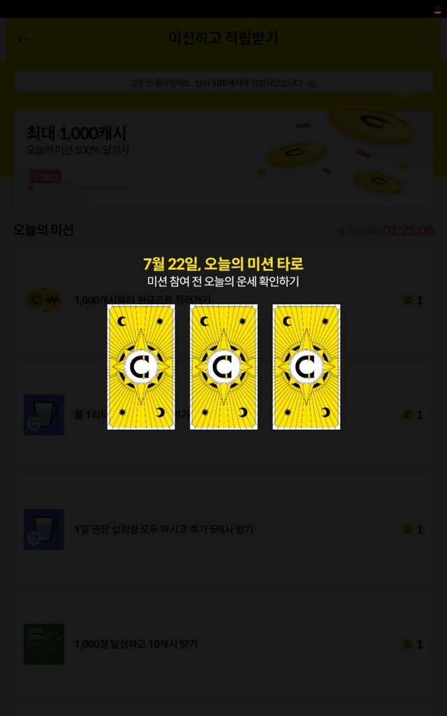 미션 잊고 있다가 급하게 들어갔는데 타로만 건졌어요ㅠ 다행히 걷기는 성공이네요~^^
