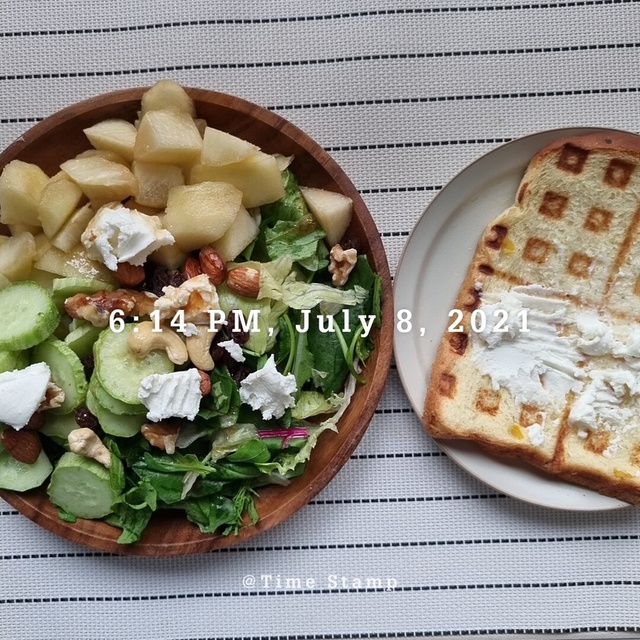 요즘 살을 좀 빼려고 식단도 생각하며운동도 나름 열심히 하려고해요.오늘의 샐러드 한끼입니다 :-)복숭아와 오이, 견과류, 리코타치즈를 넣은샐러드를 만들어먹었어요.리코타치즈와 오리엔탈 소스가 정말 잘 어울리더라구요.빵도 한쪽 먹고싶어서 와플팬에 굽고 크림치즈 대신리커타 치즈를 발라서 먹었어요. 달진않지만 그럭저럭 먹을만 하더라구요.