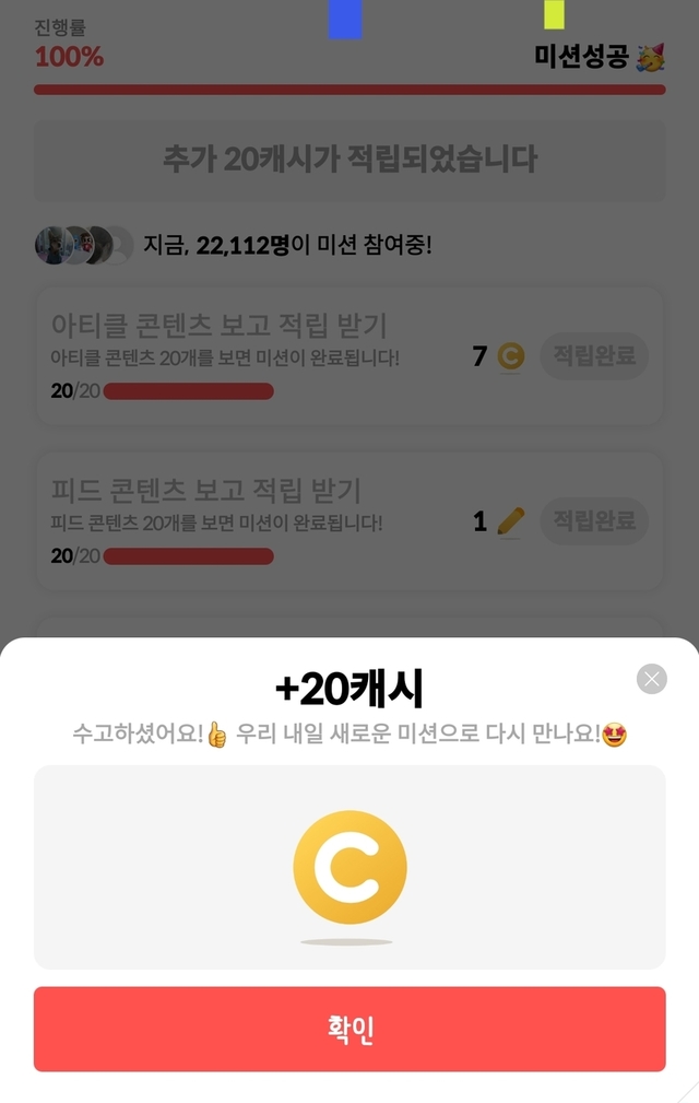 🥳랜덤캐시 20원 당첨!! 미션 success💯