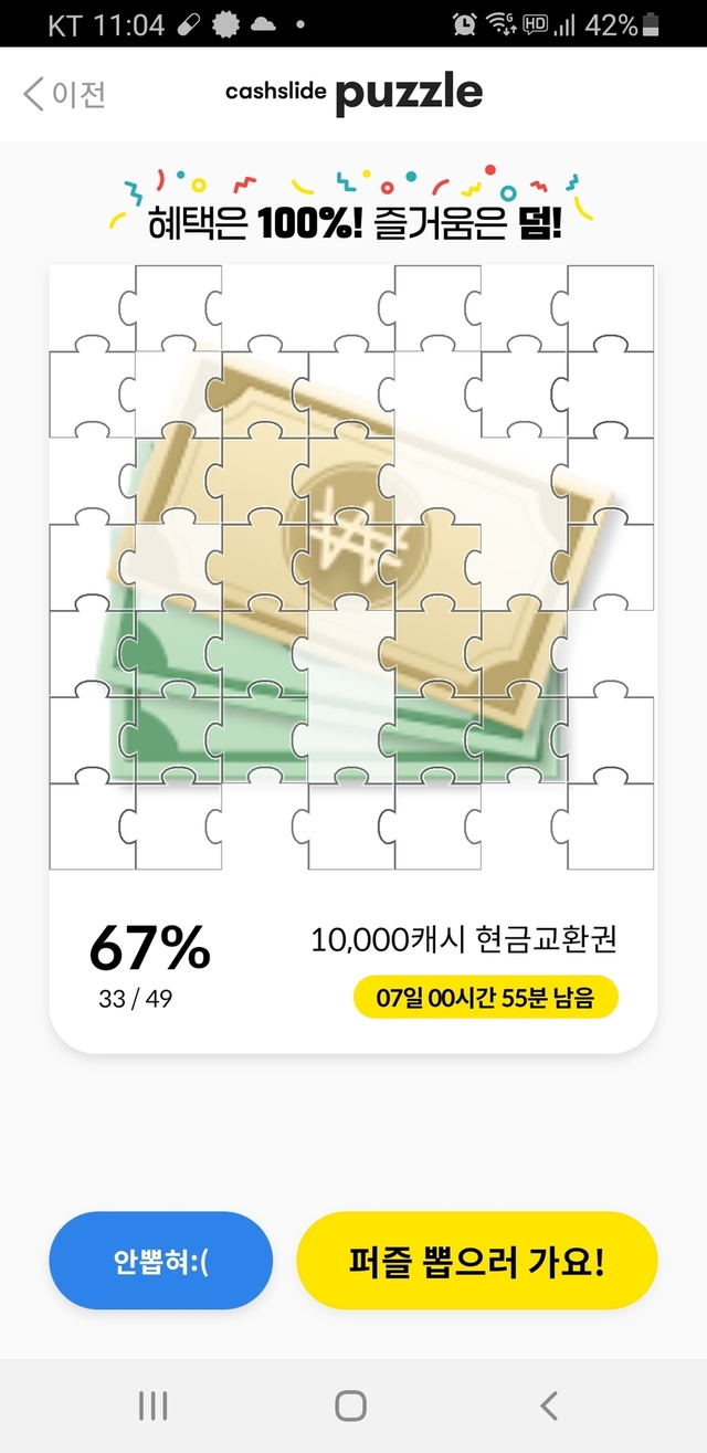퍼즐 그냥 재꼈는데 100캐시 주는 퍼즐이 생겼네요. 아침에 피드 들어왔다 알았어요. 10만명 중에 2천5백명정도 성공이니 캐피님들 서둘러 참여하세요~2시간 성공률