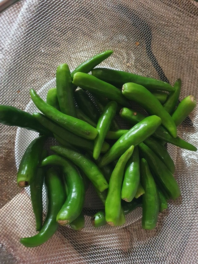 요즘 끝물고추 나오지요요골 식초물에 담궜다가 물기빼요반을 갈라 굵은 소금에 재워 밤사이 냉장고에 넣어요기름을 두르고 볶아서 진간장 매실넣고 볶다가 참기름 깨 넣으면 끝요~**개운하고 좋아요 😀