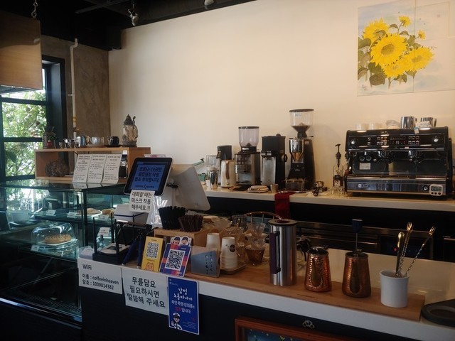 우연히 간 양산신도시 택지 내에 있는 COFFEE人HEAVEN~커피와 헤븐 사이에 사람인자가 노란색으로 크게 적혀있는 간판이 인성적이었다. 또 가게 주변과 실내에 가득한 크고 작은 화분들이 테이블 사이에 파티션 역할을 하며 좀더 프라이빗한 공간을 연출했다. 싱그러운 느낌은 보너스다. 처음 간 커피집이지만 공복이라 수제요거트로 픽! 사장님이 직접 만든 요거트에 직접 만든 블루베리청을 듬뿍 넣어 담백하고 건강한 단맛이라 마음에 들었다. 다음 번엔 아이와 함께 가도 좋을 것 같다. 사장님이 커피를 직접 볶기때문에 신선하고 깊은 맛을 즐길