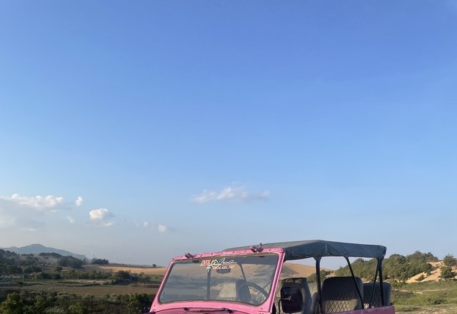 하늘과 핑크색SUV 그리고 모래언덕