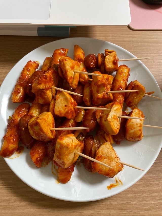 먼저 마늘과 파를 볶아 파기름을 낸후 고추장 고추가루 간장 설탕 사과쨈등을 넣고 양념을 볶은후 닭가슴쌀 썬것과 떡 소세지등을 넣어 함께 볶아 꼬치에 끼워 먹어요~건강식이라 생각하며 ㅎㅎ