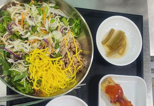 오늘의점심메뉴참치생야채비빕밥및닭볶음탕및미역냉국