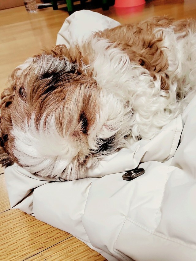 미용해서 그런가 며칠 기운도없고 산책 나가서 걷지도않고 저리 앉아있네요.안아서 바람 좀 쐬주고 들어갔어요