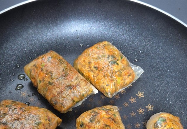 만두빚다 생각나서라이스페이퍼로말아서구웠네요고기가 안들어가서 겉에만 익히면 되니 편하네요음. ..쫄깃하니 맛있어요