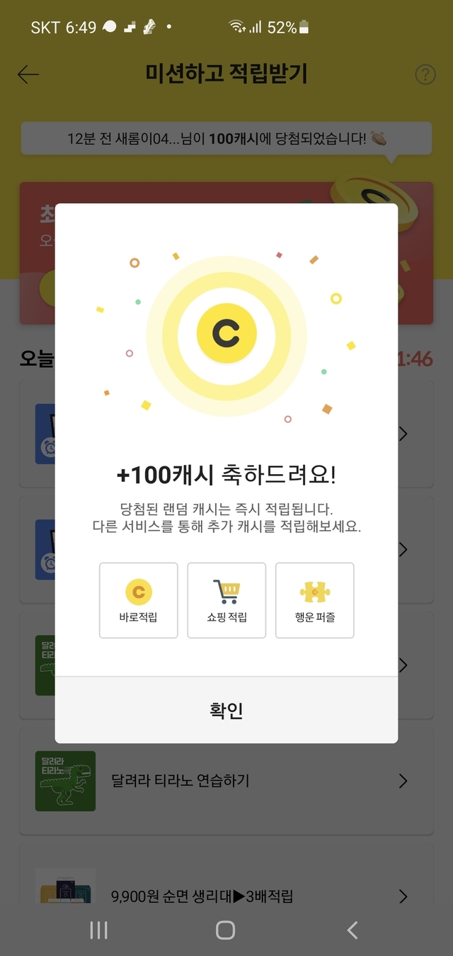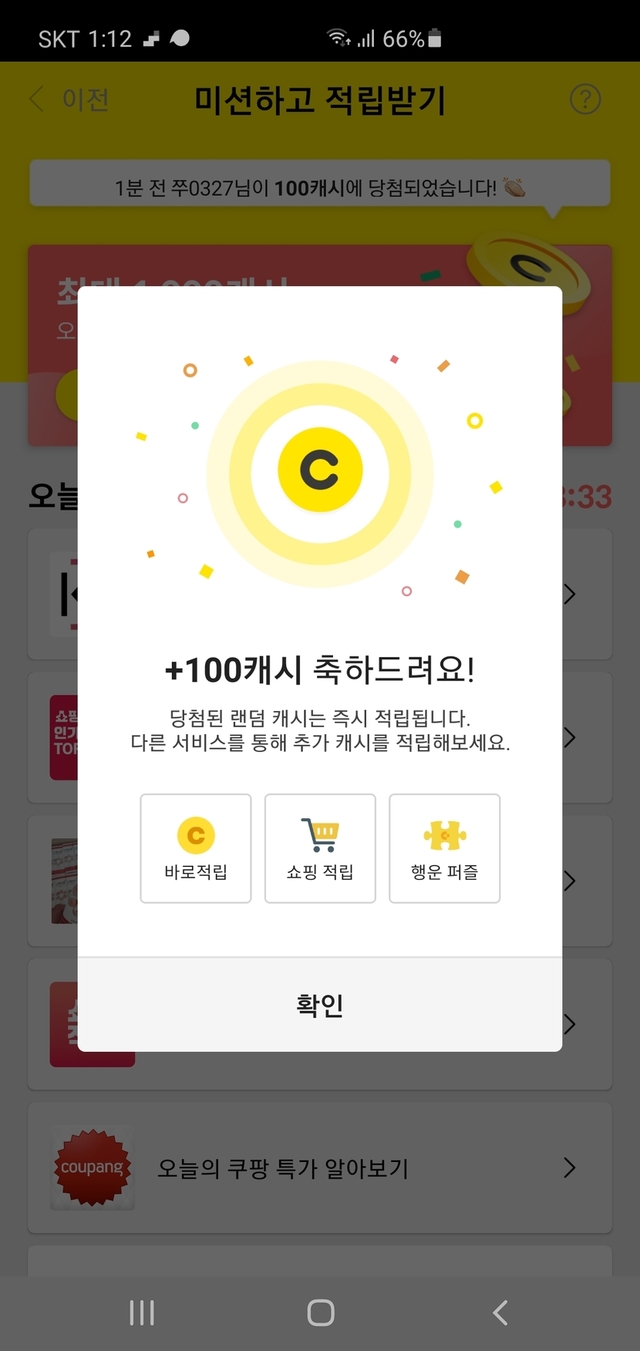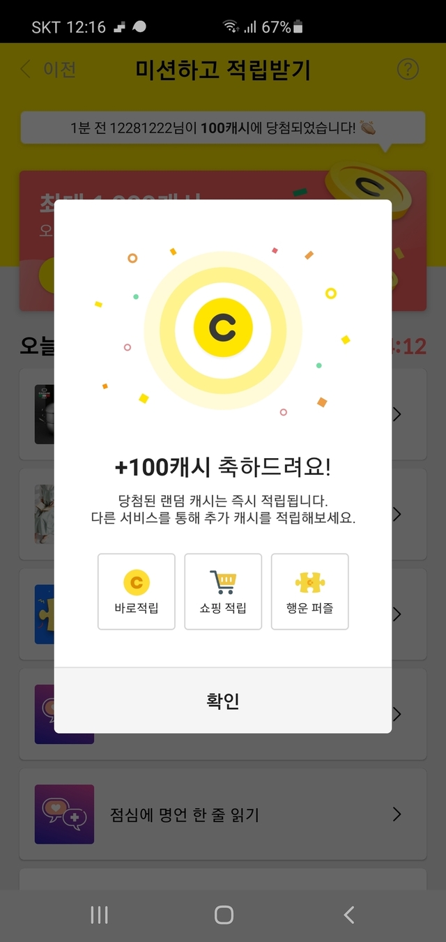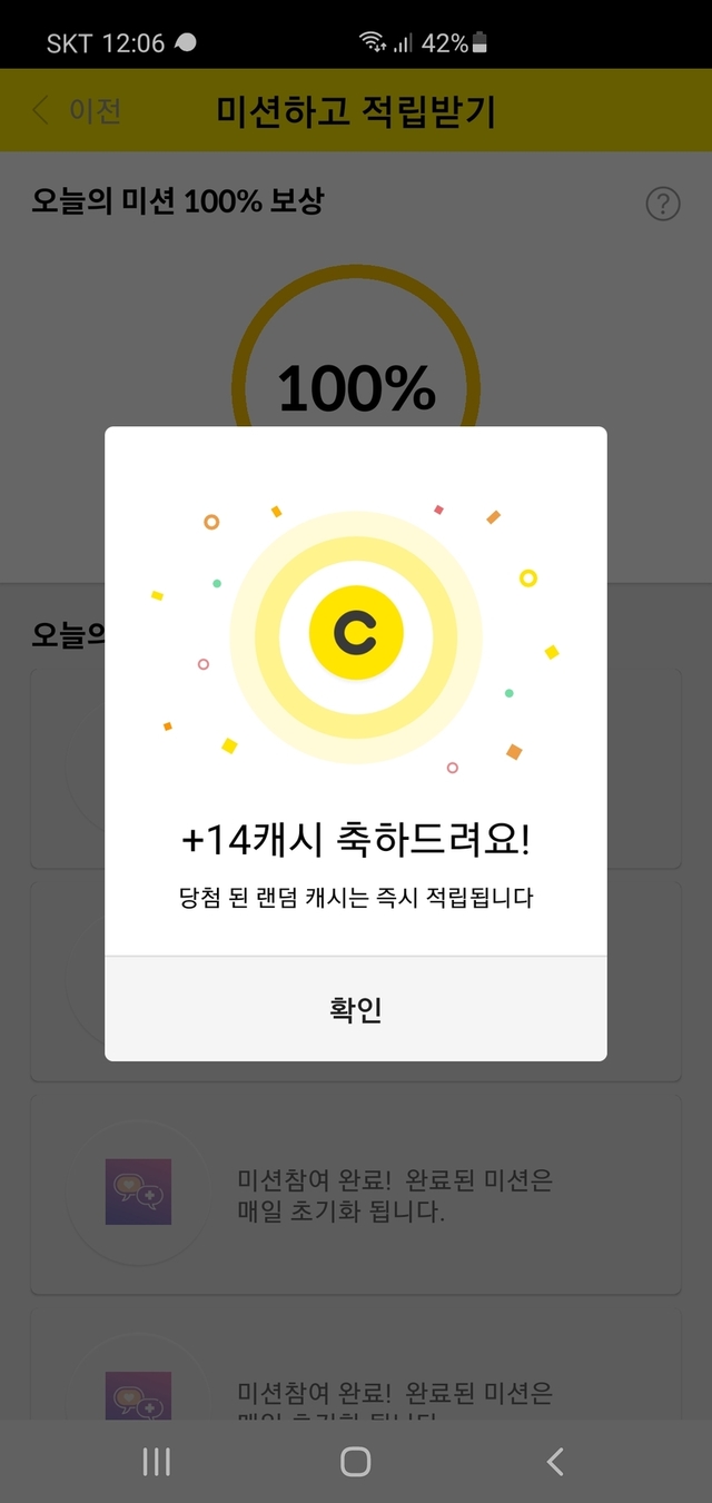 😄😄 처음으로 미션 100캐시 받았어요. 오늘도 즐거운 휴일 보내세요😄😄