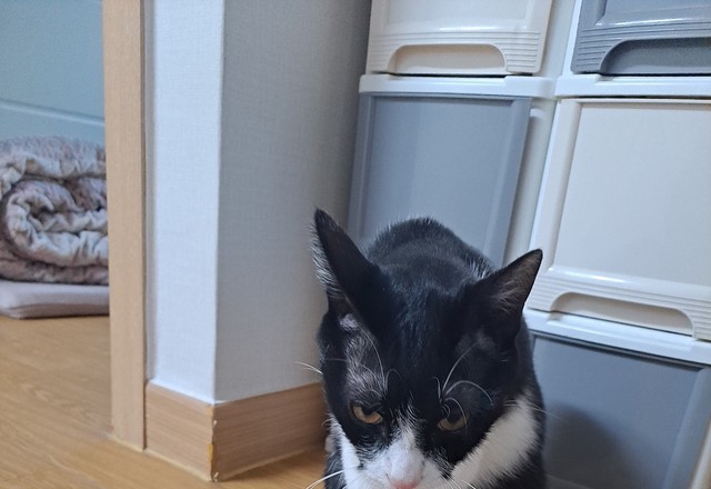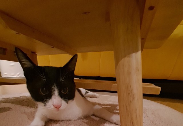 좁은 탁자 아래로 기어이 들어가는 뚜루