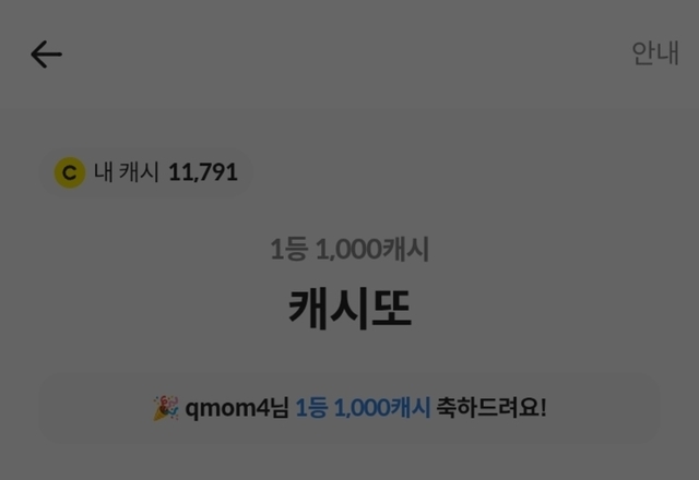 아무 생각없이 습관처럼 캐시또 들어갔다가2등이 나와서 깜짝 놀랐어요500원의 행복😄