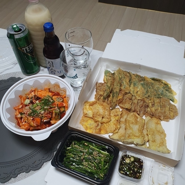 비오는날에 가장 먹고싶은건 전!! 과 막걸리!근데 육전도 먹고싶고 버섯전도 먹고싶고못 골라요ㅜㅜㅜ다 먹고싶어요ㅜㅜㅜㅜ그렇다면 모듬전을 시키고!ㅋㅋㅋ막걸리와 맥주취향에 맞는 주종을 선택하여 준비를!덤으로 매콤달콤새콤한 오징어 무침까지 곁들이면!!!꺅 군침 제대로!ㅎㅎ