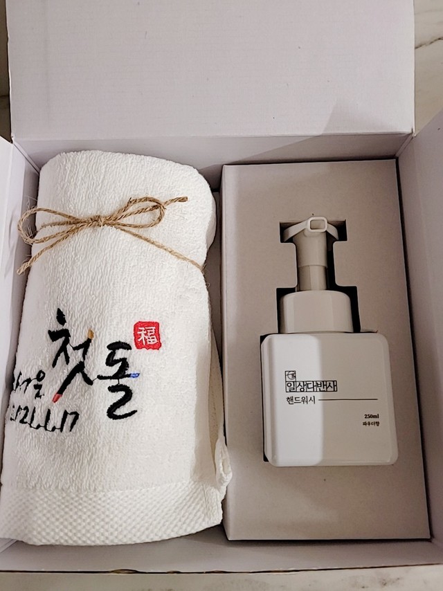 🎁돌 선물로 요즘은 수건+손세정제를 주네요.부엌에서 조그마한 손세정제가 필요했었는데 요긴하게 너무도 감사히 잘 쓸것 같아요.오랜만에 받아 본 돌 선물이네요~~역시 선물은 무엇이든지 감사하고 고맙고 좋아요.오늘도 좋은 하루 홧팅하세요