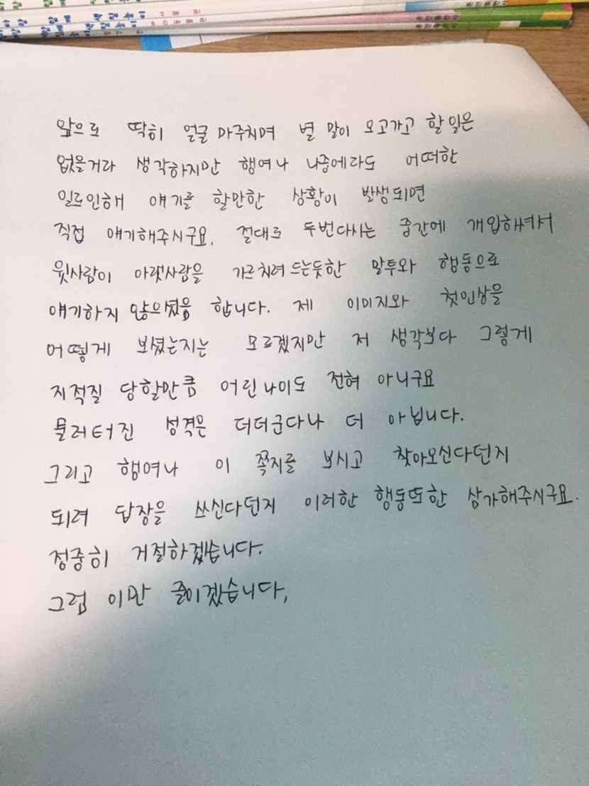 자꾸 따지는 말투로 어른분께 얘기하시고 따지고...그렇게 쓰레기 문제는 일단락되고 엊그제 공사한집을 찾고 계셨어요.업자분께서 밀차를 잃어버리셨는데 찾으셔서 찾아주실려고..그래서 공사했는지 물어보시는데 또 따지기 시작하셔서 제가 밀차를 찾아주실려고 그런다고 말씀드릴려고하는데 왜 저한테 끼어드냐고 그 화살이 저한테 돌아오네요..중간에서 싸움말리려는것도 죄가 되나요?이게 그렇게 큰 잘못인가요?그래서 저도 그집에서 저한테 잘못한걸 따졌더니 오늘 장문의 따지는 말투의 편지를 받았네요.