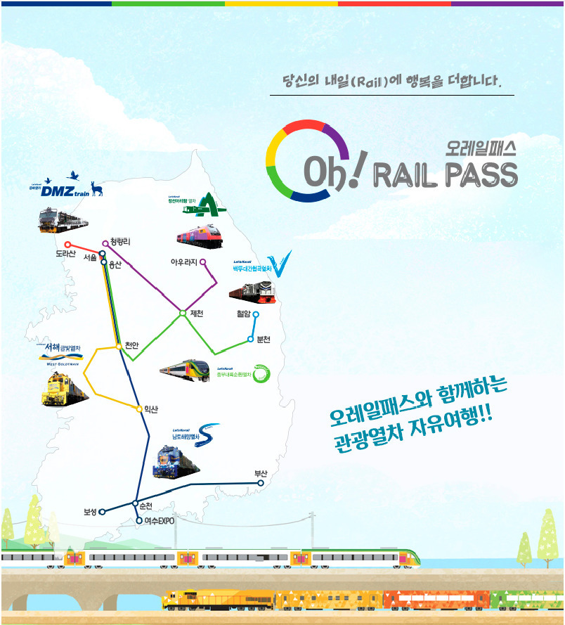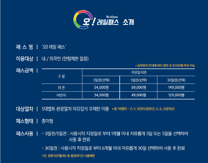 5대 벨트 관광열차를 3일, 5일 또는 30일 동안 무제한으로 탈수 있는 오레일 패스앞에서 소개한 다른 패스와 가장 큰 차이첨은 일반열차는 이용하실 수 없어요~그리고 날짜도 연속하여 이용하실 필요도 없답니다~구간에 상관없이 회당 5,000원으로 좌석 지정도 가능하단 사실!국내 여행 패스 정말 다양해졌죠??이 중에서 내가 떠날 기차여행에 맞게 구매하신다면 교통비가 많이 절약되실 겁니다~절약하신 교통비로 더 맛있는 음식과 더 좋은 숙소로 우리 모두 즐거운 기차여행 다녀오자고요~~ https://band.us/n/a6ae3am2I0ZaP 더 많은 여행 정보를 원하신다면~