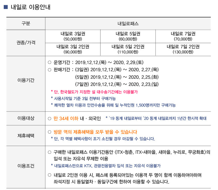 가장 많이 알려진 패스권입니다. 청춘들의 특권이라 불리는 내일로3일 또는 5,7일 연속 기간 동안 ITX-청춘, 새마을, 누리로, 무궁화호를 자유롭게 이용할 수 있습니다.단, KTX와 관광 전용 열차는 제외랍니다.보통 하계(6월 초~9월 중순), 동계(12월 초~3월 중순) 나눠서 진행되는데 2019 동계 기준으로 만 34세 이하의 청춘들만 구매가 가능해요~!!괜히 청춘들의 특권이라고 불리는 게 아니죠??구입 전 꿀팁을 하나 알려 드리자면 발권역에 따라 그 지역의 할인 혜택을 가지고 있어요.예를 들어 서울역에서 발권한다면 여수, 목포, 곡성, 경주, 춘천 등에서 숙박 할인이 된다는 사실!!놓치지 말고 꼭 적용받으세요~그리고 열차 내에서 승무원이 신분증 및 티켓을 확인하니 꼭 챙겨 주세요~종이승차권은 재발매 불가하니 더 잘 챙기셔야겠죠?