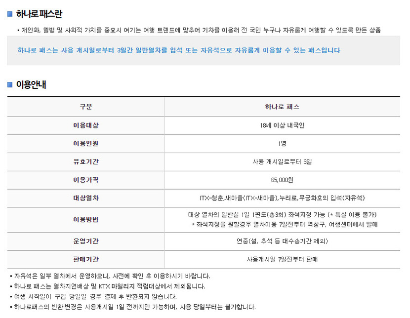 청춘이 아깝게 지나버려 내일로를 이용하실 수 없다고요?그렇다면 18세 이상 내국인이면 누구나 이용할 수 있는 하나로 패스는 어떨까요?1인 65,000원으로 ITX-청춘, 새마을(ITX-새마을), 누리로, 무궁화호 이용이 가능해요.연중무휴 이용이 가능하지만 설이나 추석 같은 명절 기간에는 제외됩니다.원하시는 열차의 일반실을 1일 1편도로 총 3회 이용할 수 있는데 열차 이용 7일 전 미리 예약해야 하고 사용 개시일 7일 전부터 판매되니 주의해 주세요~