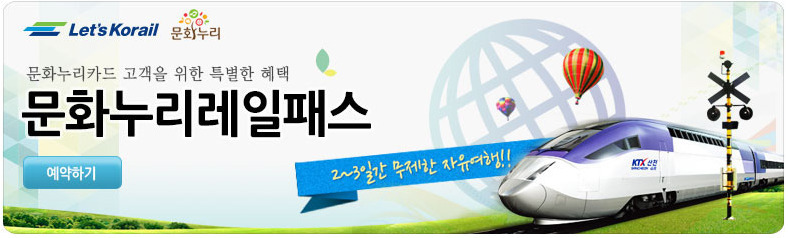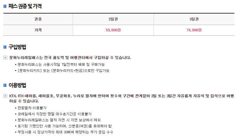코레일에서 새롭게 출시한 문화누리 패스는 문화체육관광부 통합문화 이용권 제도에 따라 통합문화 이용권 수혜자가 KTX 및 일반열차를 2~3일간 자유석 또는 입석으로 자유롭게 여행하실 수 있는 문화누리 카드 전용 기명식 철도 패스입니다.구입은 문화누리 카드를 가지고 계신 분들만 구매 가능한 패스로 KTX와 일반 열차를 2,3일간 자유롭게 타실 수 있는데요. 명절을 제외한 모든 날짜에 사용 시작일 7일 전부터 구매할 수 있으며 결제는 문화누리 카드 또는 문화누리 카드+현금으로 만 가능하답니다.
