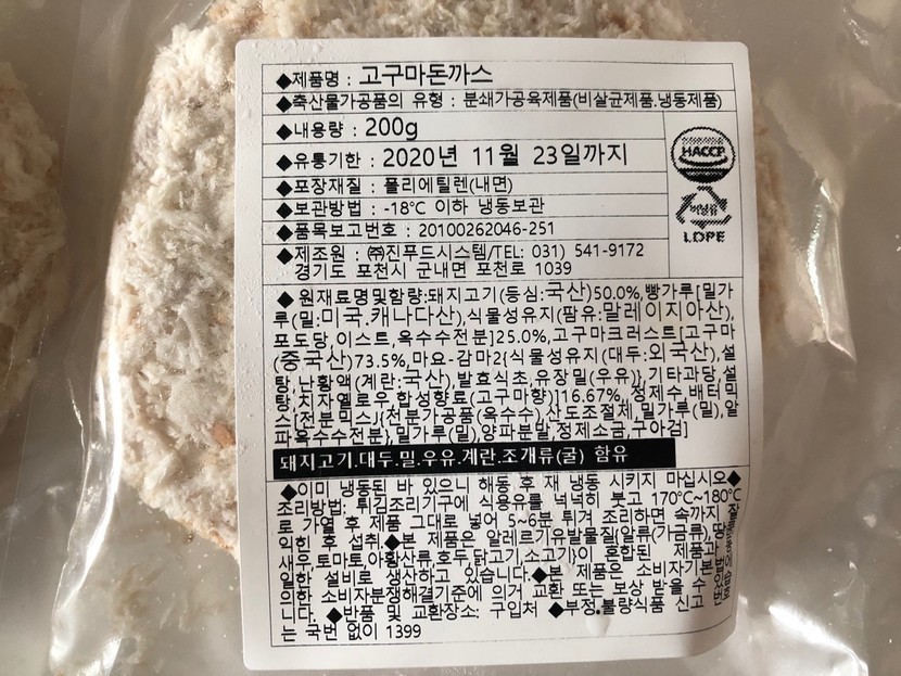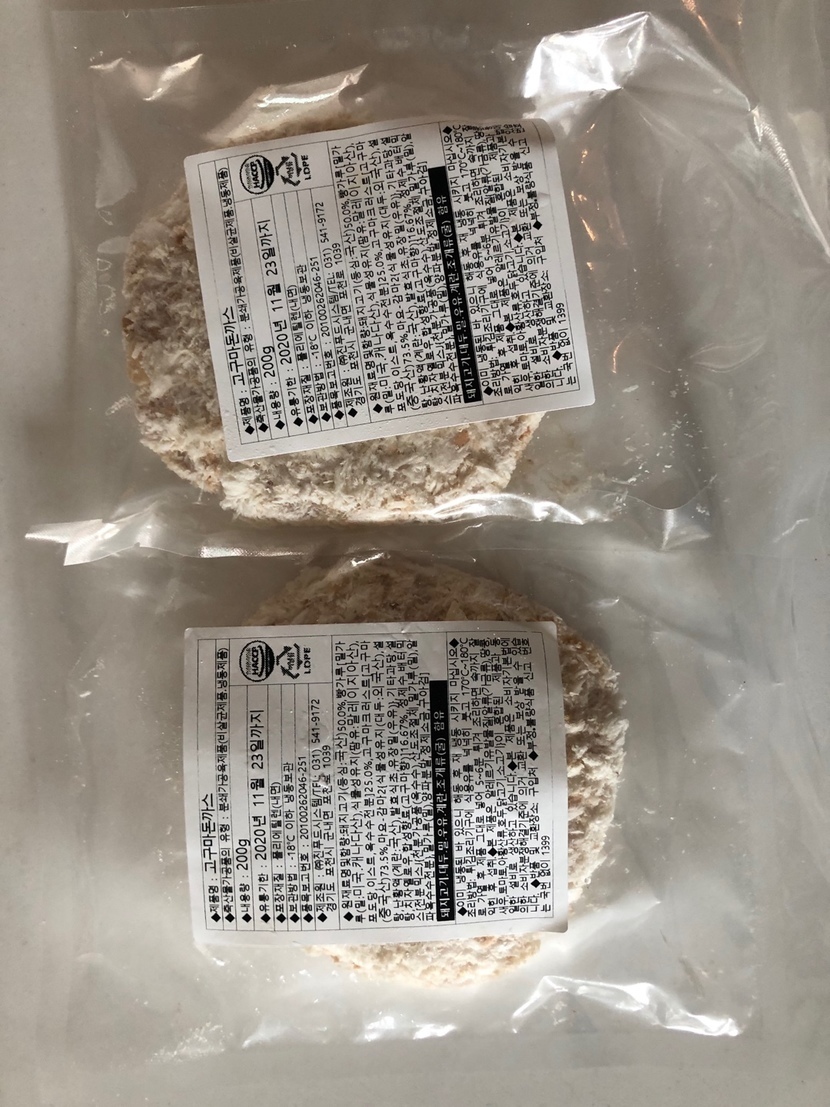 상세내용을 살펴봅니다.내용량은 200g 이구요. 유통기한은 2020년 11월 23일까지예요.제가 주문한 날짜 기준으로 보면 대략 8개월 정도의 유통기한이네요.생각보다 꽤나 유통기한이 길어서 놀랐어요.개별 포장되어 있고 냉동보관하니 가능한 유통기한인듯 합니다!보관방법은 -18도 이하 냉동보관이네요. 가정집에서는 냉동실에 넣어두는 것이 최선이겠죠?재료를 살펴보면 일단 돼지고기등심이 국내산이구요. 밀은 미국,캐나다산, 식물성유지는 말레이시아산으로 되어 있어요.중국산은 거르고 싶은데 돈까스 속에 들어가는 고구마크러스트는 중국산이네요.요즘 어디든 중국산이 포함되어 있어서 중국산 재료가 들어가지 않는 식재료 구입은 쉽지 않더라구요.