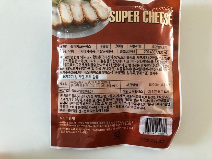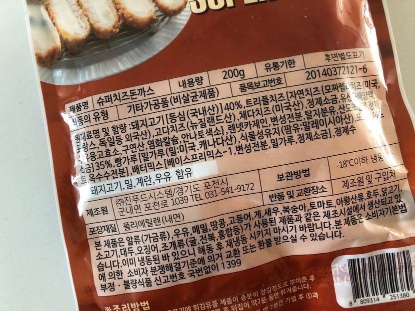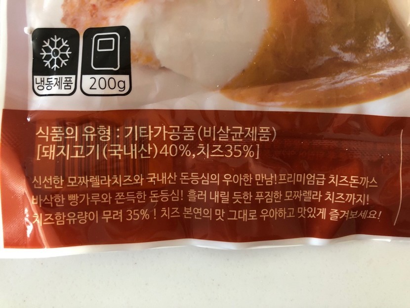 고구마 돈까스와 마찬가지로 돼지고기 등심은 국내산을 썼구요, 치즈는 미국, 프랑스, 독일 등 외국산이네요.모짜렐라치즈와 고다치즈, 체다치즈까지! 치즈 종류를 많이 썼나봐요 :-)역시 -18도 이하 냉동보관하도록 되어 있네요.