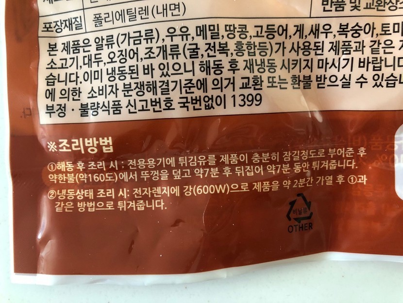 자세한 조리방법도 나와 있어요.1) 해동 후 조리 시: 전용용기에 튀김유를 제품이 충분히 잠길정도로 부어준 후 약한불 (약 160도)에서 뚜껑을 덮고 약 7분 후 뒤집어 약 7분동안 튀겨줍니다.2) 냉동상태 조리 시: 전자렌지에 강(600W)으로 제품을 약 2분간 가열 후 1)과 같은 방법으로 튀겨줍니다.튀겨서 먹도록 되어 있네요. 에어프라이어를 사용하셔도 좋을 것 같구요.