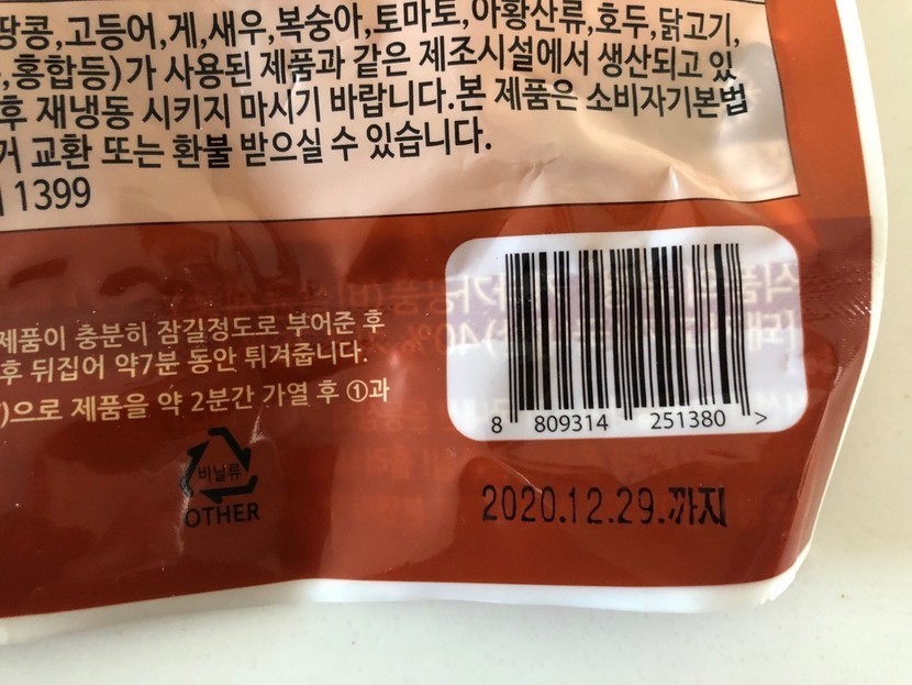 유통기한은 2020년 12월 29일까지 입니다. 주문했던 날짜 시점을 생각해보면 8개월 이상의 유통기한이라 넉넉하네요.하나씩 개별 포장되어 있어서 해동했다가 다시 냉동했다가 할 일은 별로 없을 것 같아요.