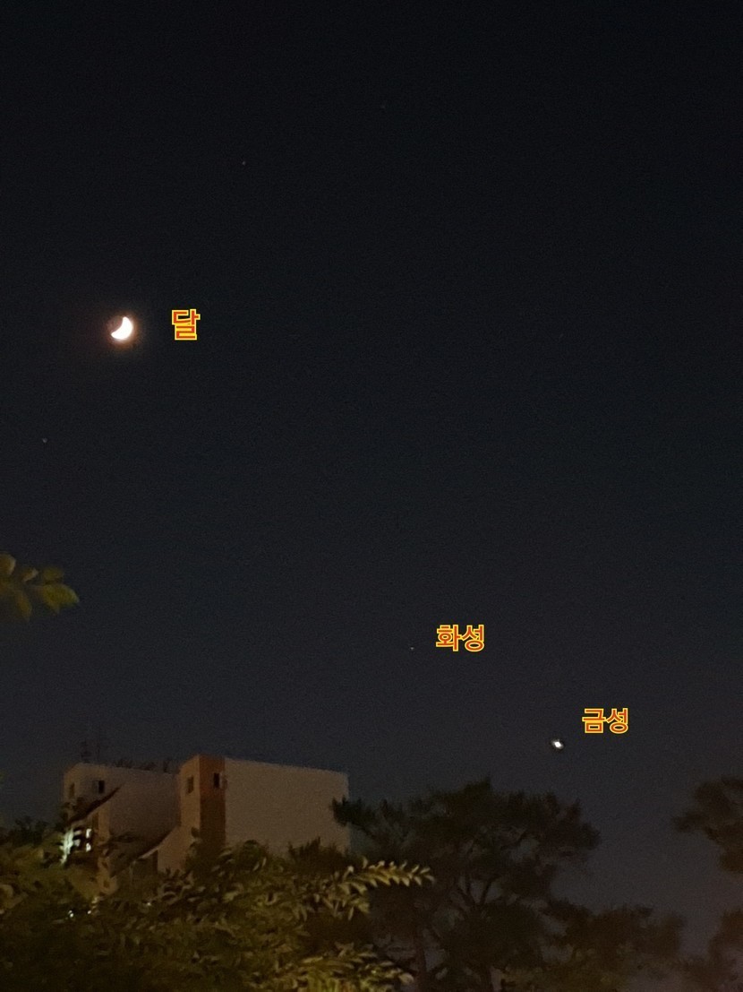 23.06.24 891 읽음 달과 화성 그리고 금성이 일렬로 23_0623 비온뒤 버섯처럼 구독하기 5 10 콘텐츠의 수익 6 출처 : https://m.blog.naver.com/benignmoon/223137144396🔳 촬영일 / 장소 : 20230623 / 경기 의정부🔲 달과 화성 그리고 금성이 일렬로 나란히 내눈에 들어왔다.〰⭕ 어제는 달,화성, 금성이 삼각형을 이룬다고 해서 보려고 나갔더니 흐린 구름에 가려서 볼수가 없었다〰⭕ 오늘 혹시나하고 나가봤더니〰⭕ 삼각형보다 더 멋진 일렬로 늘어선 풍경이라니..달사진금성사진 10 0 / 300 입력