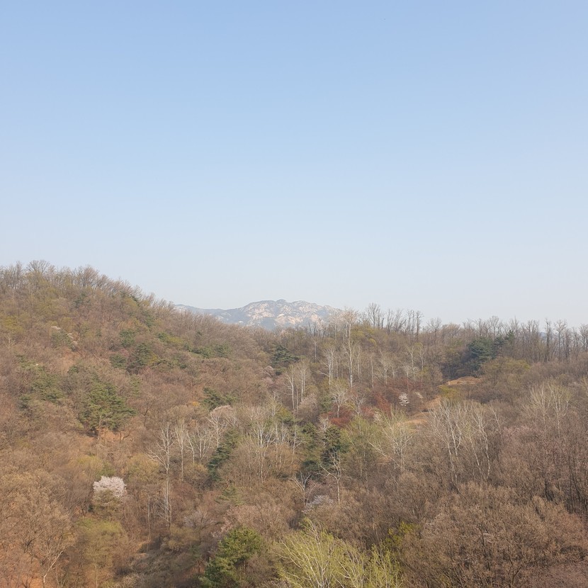 집 거실에서 열일하다가 문득 바깥을 봤는데, 북한산과 이말산의 콜라보 뷰가 똭^^ 당이 똑! 떨어지는 시간, 아메리카노에 쿠키 곁들어 집에서 봄날을 만끽합니다♡