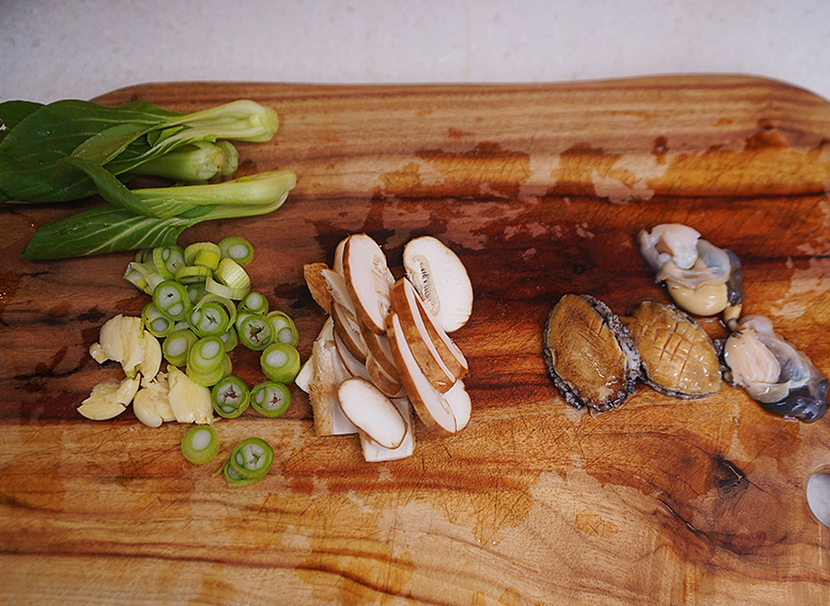 재료 : 좋아하는 라면 1봉, 식용유 1 큰 술, 마늘 2쪽, 대파 6cm, 표고버섯 1개, 전복 2개, 청경채 1개, 물 3컵