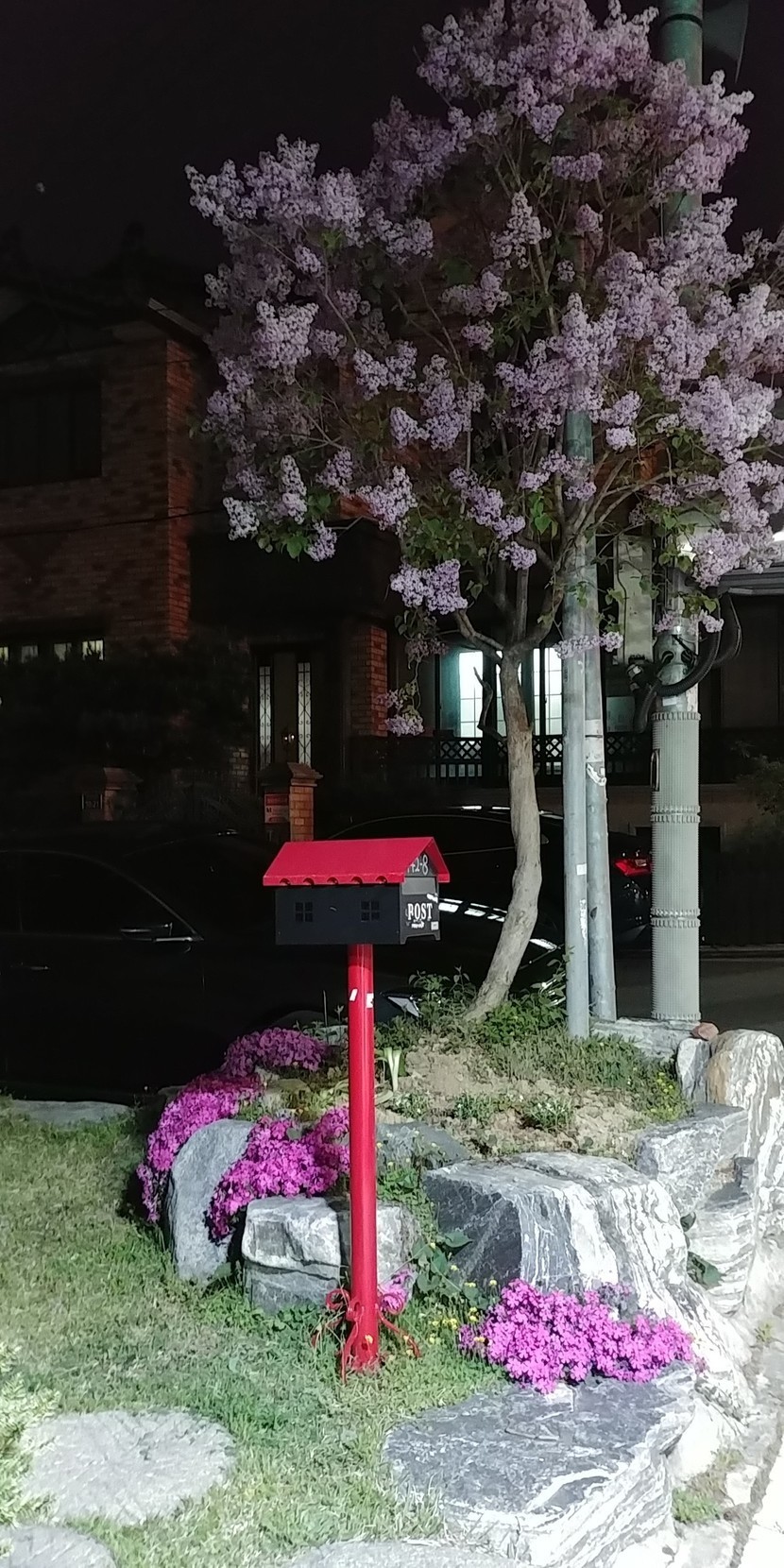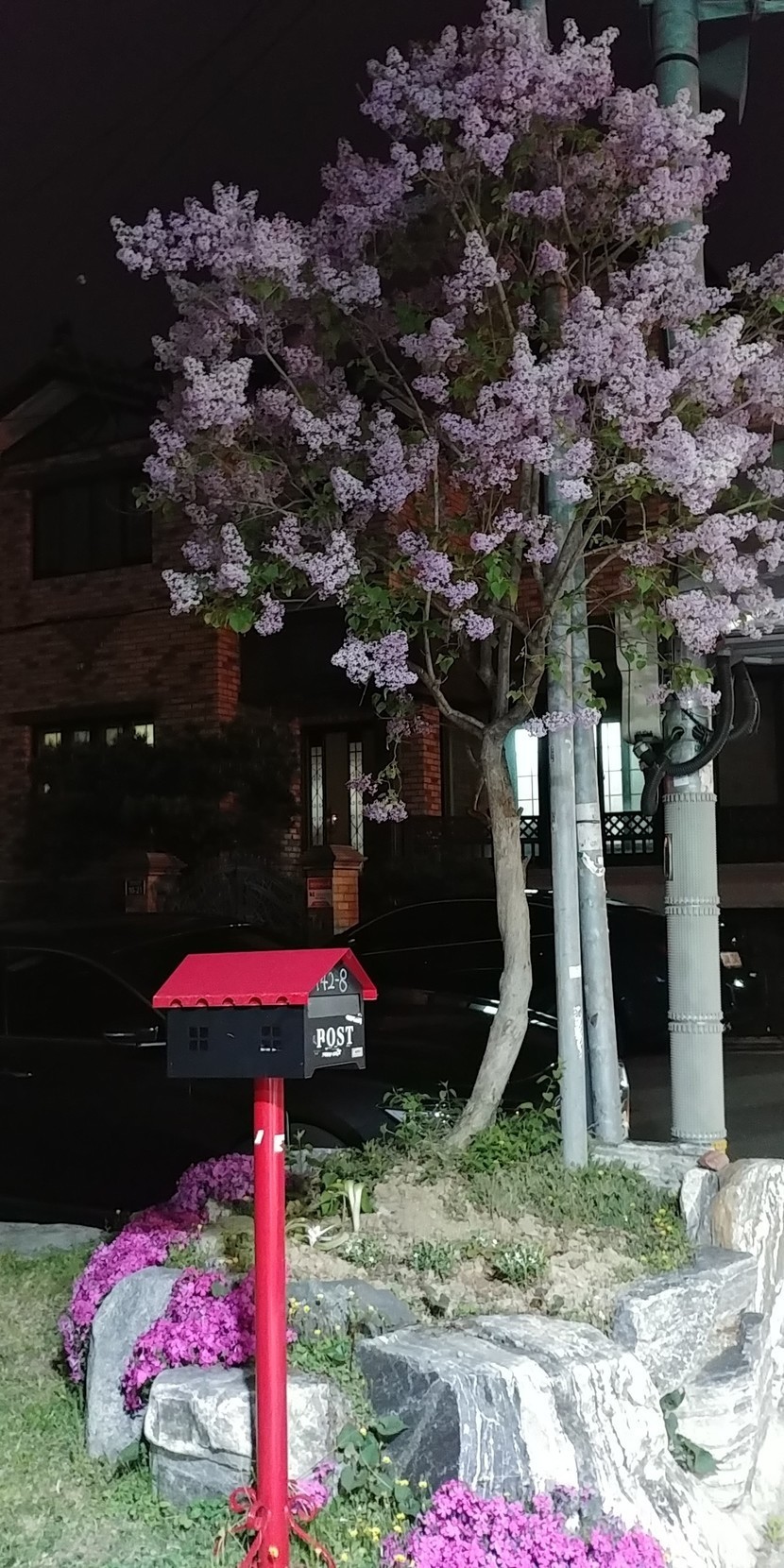 빨간 우편함과 라일락꽃이 만개 한 이웃의 정원