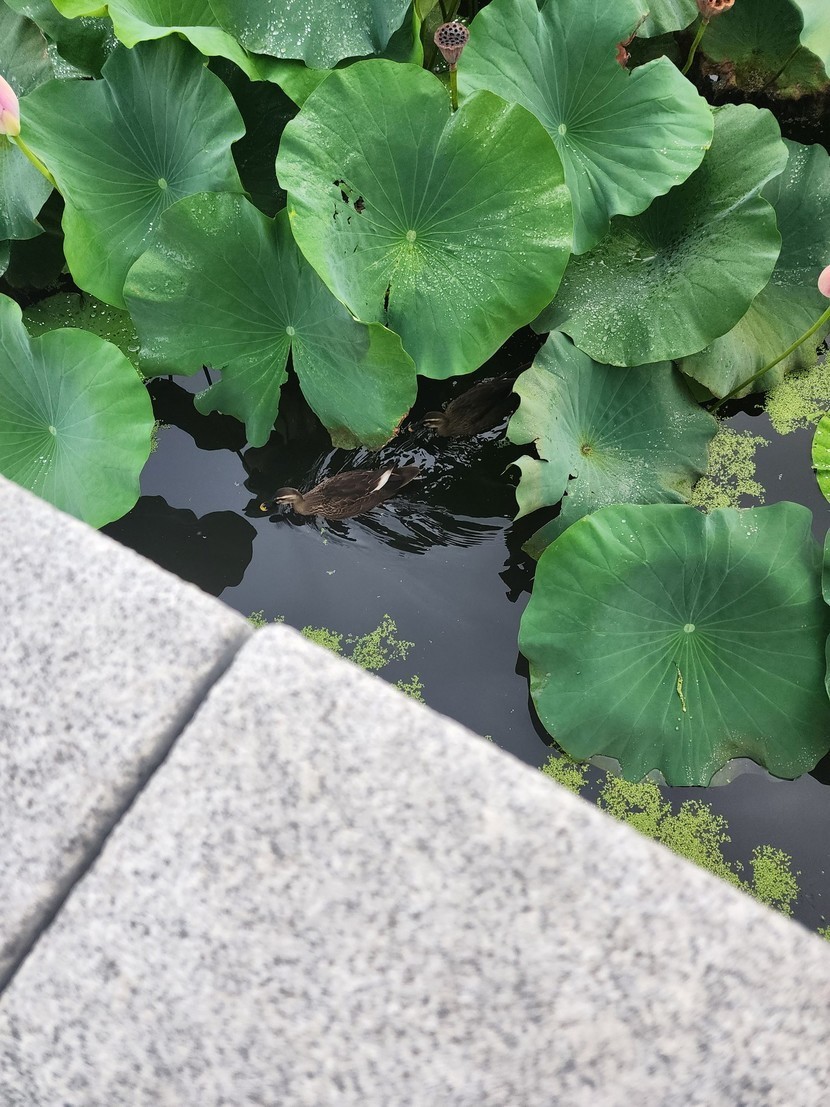 연밭에 오리가 헤엄치고 있네요