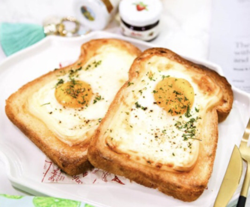 마요네즈를 식빵 테두리에 돌려줘요. 그 다음 계란을 테두리안에 올려줘요. 이때 계란 노른자는 터트려줘요.(터질 수 있어요) 계란위에 소금을 약간 뿌려줘요.