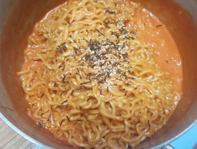 제가 불닭볶음면을 좋아하는데 핵불닭은 정말 너무 맵더라구요ㅠ 먹긴하겠는데 속이 너무 쓰리더라구요ㅠㅠ 그래서 고안한 핵불닭볶음면 까르보나라! 속도 안쓰리고 맛있게 매워요!필수 준비물: 핵불닭볶음면 봉지, 우유 500ml 기호에 따라+ 양파, 베이컨을 볶아 넣어먹으면 맛있어요!1. 먼저 면을 끓여 물을 빼둡니다 너무 끓이지말고 딱 풀어질만큼만 끓여요 안그럼 불어요! 2. (양파, 베이컨 넣으실 분은 먼저 조금 볶다가) 우유를 붓고 소스를 넣고 섞어 끓입니다 (소스 안넣고 오래끓이면 끓어넘쳐요ㅠㅠ 저 한번 넘쳐서 인덕션 청소하느라 고생했어욘,,) 3. 끓인우유+소스에 면넣고 좀 더 끓여요 4. 김가루 후레이크 뿌리고 맛있게 냠냠!