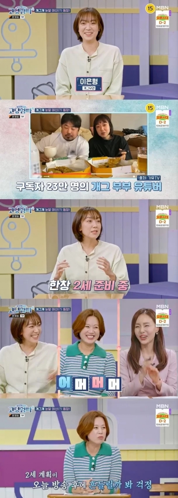 ▲ MBN ‘어른들은 모르는 고딩엄빠4’ 캡처. 개그우먼 이은형이 2세를 계획 중인 근황을 공개했다. 4일 오후 방송된 MBN 예능 프로그램 ‘어른들은 모르는 고딩엄빠4’에서는 이은형이 출연자로 나와 솔직한 입담을 뽐냈다. 그는 등장부터 유쾌한 인사를 건넸다. 자신을 ‘눈알 여신’이라 칭하며 MC 박미선을 바라봤다. 이어 “1대 눈알 여신 박미선 선배님! 제가 10대 정도 될 거다”라고 너스레를 떨었다. 둘은 동시에 눈알을 굴려 폭소를 유발했다. 이 자리에서 이은형은 근황 질문을 받자마자 “현재 2세 준비 중이다”라고 답했다. 특히 이은형은 “(남편이) 최근 20kg 정도 감량하다 보니까 요즘 또 (부부 관계가) 불타오르고 있다”라면서 솔직하게 털어놔 웃음을 줬다. 이를 듣던 박미선은 “아기 갖기로 마음먹었는데 오늘 준비된 영상 보면 마음이 흔들릴까 봐 불안하다”라며 걱정해 눈길을 끌었다. 뉴스24
